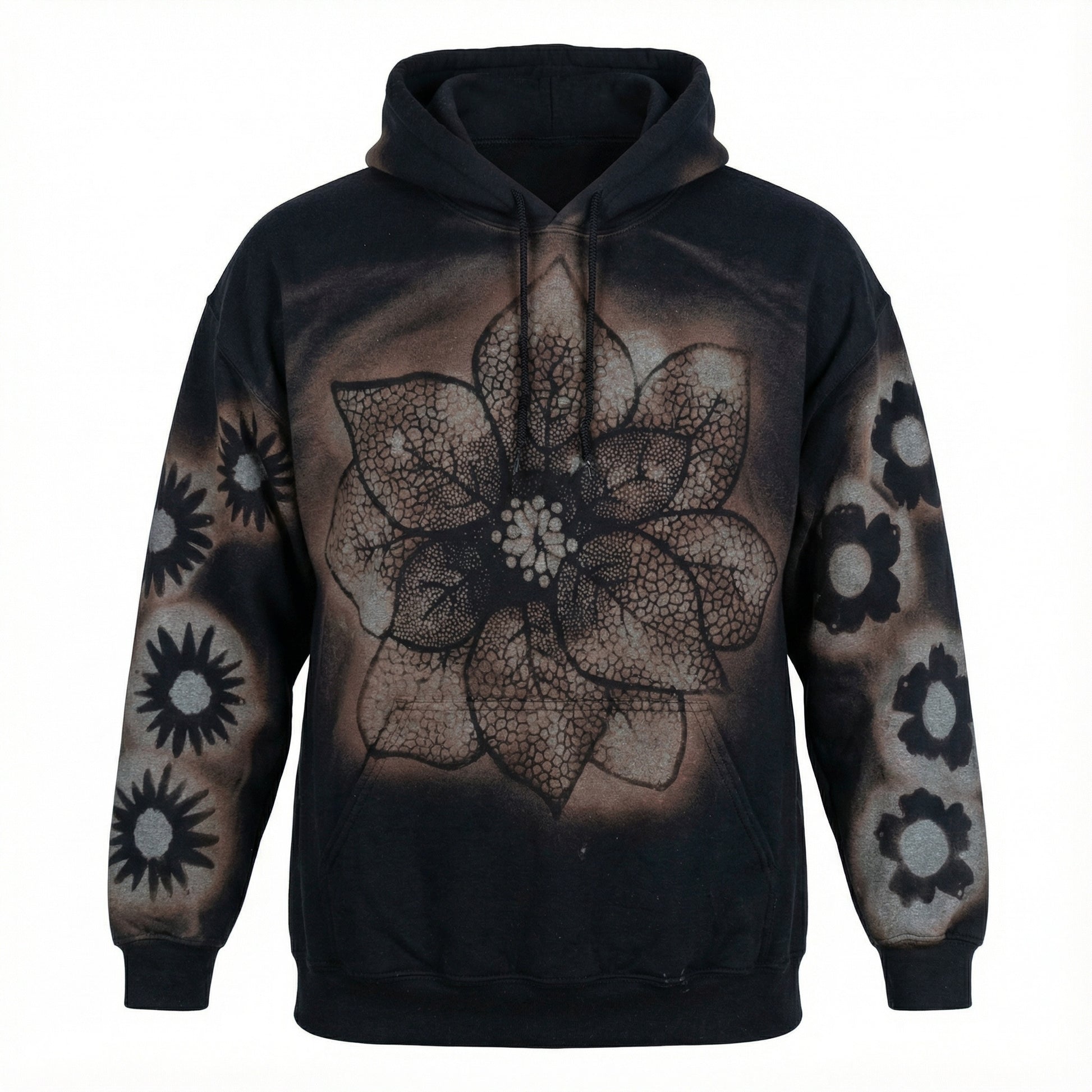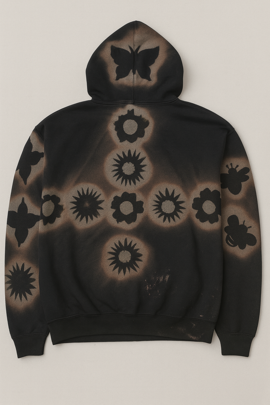 One of one hand-finished hoodie with layered stencil work and a cracked floral centerpiece. Distressed fade, raw edges and controlled chaos throughout with dark tones. No repeats. No restock .This piece stands alone.
