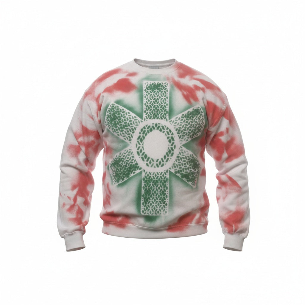 Hand-sprayed red and white "ICY" dye with custom green geometric cross. Each detail is intentional, raw and impossible to duplicate.